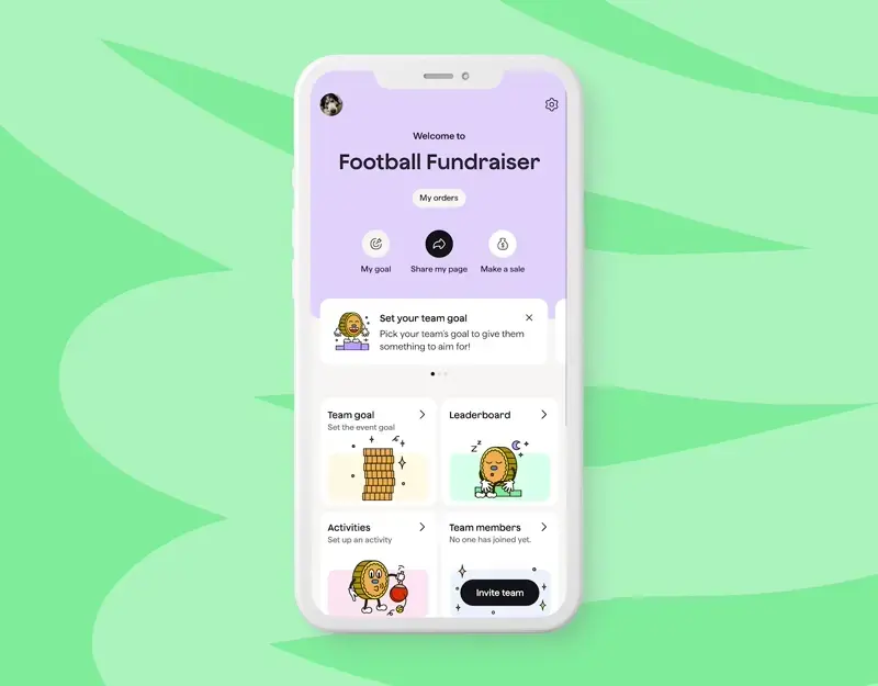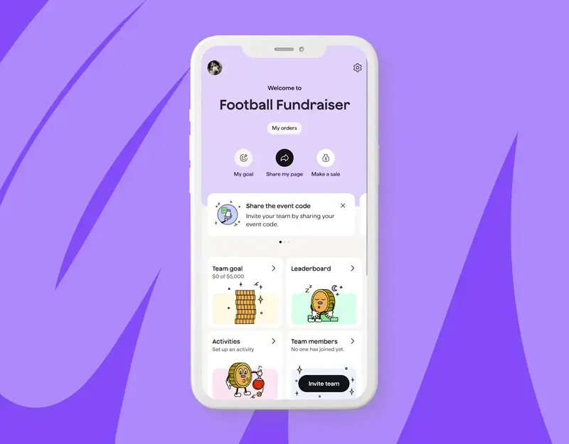 You can invite others in your group to participate in your fundraiser from the app. Head to the bottom of your event page and select "Share event code."